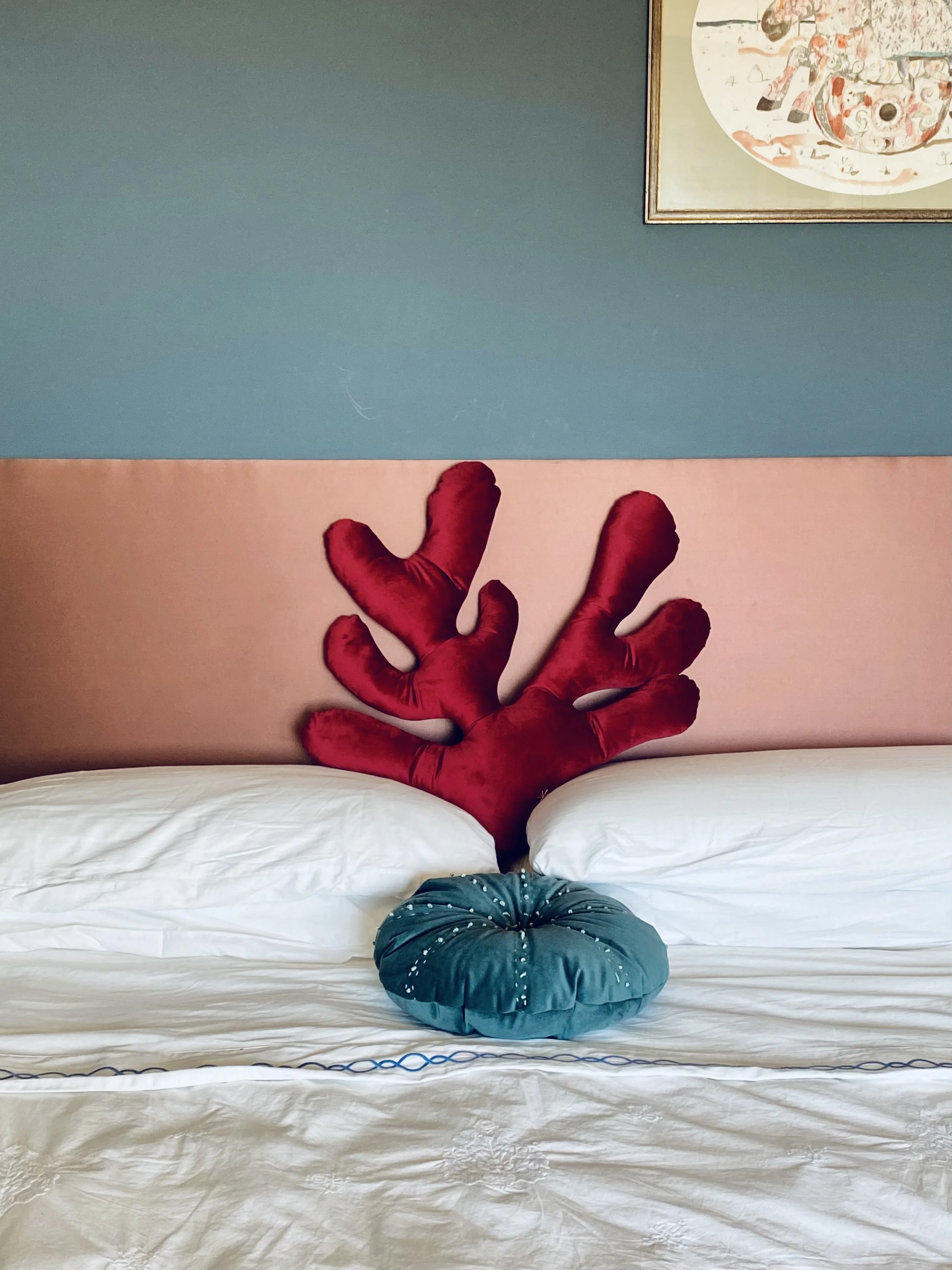 Cuscino fluttuante scultoreo e vellutato, come una creatura marina antica. Talismano per chi cerca rifugio nella forza quieta della delicatezza.